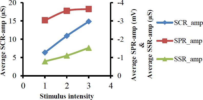 Shows relation between average values of amplitudes of SCRs, SPRs and SSRs on one side, and the stimulus intensity on other side.
