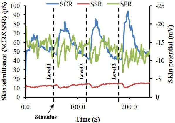 SPRET (Skin Potential Relative Early Turn) was extracted from the time of the SCR peak minus the time of the SPR peak, divided by the time from SCR onset to SCR peak, and multiplied by 100%. This score was calculated to show when the SC and SP waveforms are different [21].