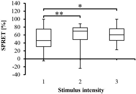 Box-plot with medians, quartiles and the min and max as whiskers, showing the SPRET percentage for all participants with respect to the stimulus intensity.*p<0.05 and **p<0.005.