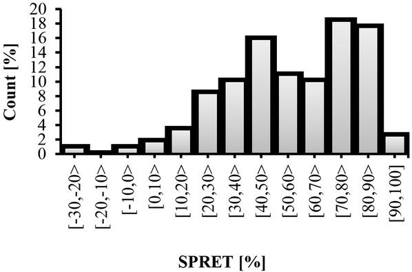 Figure 6 shows the percentage value of SPRET for all SC and SP responses from all test subjects and how increase in SPRET values coincides with increase in stimuli intensity provoked by the electrical stimulator. ANOVA analysis yielded a significant (p<0.001) difference between groups (stimuli intensity), and pairwise comparisons between the stimuli intensity were performed with Sidak post hoc pairwise multiple comparison tests, revealing significant differences between some stimuli intensity, as shown in Figure 6. As seen in the histogram in Figure 7, negative SPRET (i.e., SPRET <0) was found in two responses, where the SPRs peaked later than the SCRs, whereas in all other responses SPRs turns before SCRs (positive SPRET) with most SPRs peaking from 20 to 90% earlier and the largest category is 70%-80%.