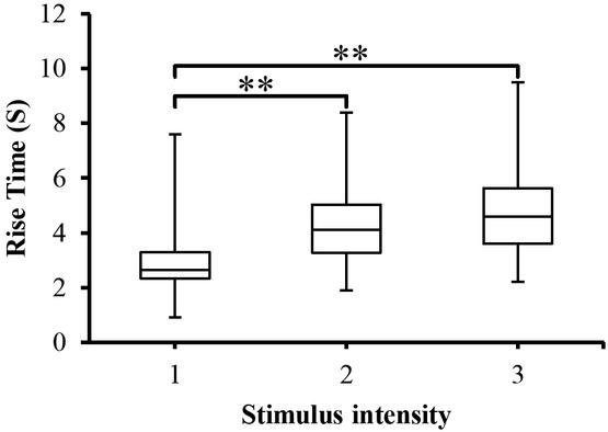 SCR_Trise to the different stimulus intensity presented as box-plots with medians, quartiles and the min and max as whiskers. **p<0.005.