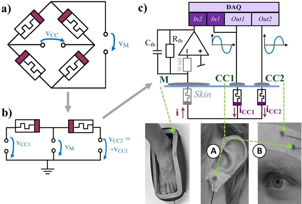 A custom-built measurement system (see Fig. 1c top) was used for the recordings. A data acquisition card (DAQ) (type USB-6356 from National instruments) enabled the application of two constant voltages and simultaneous reading (both was performed with 500 samples per period). The DAQ was connected to a personal computer and controlled by a custom-made software, which was written in NI LabVIEW (version 2014). The generated voltages vCC1 and vCC2 were provided at the “out1” and “out2” ports, respectively. The provided voltage vCC1 was read at the channel “In1” to measure the delay from signal generation inside the DAQ to actual provision by the analog-to-digital converter. A transimpedance amplifier (with Rfb = 56 kΩ) was used to convert the current, i, through the skin into a voltage that can be read by the DAQ (input “In2”). With the small capacitance Cfb = 4.7 nF in parallel, high frequency noise was reduced in addition. To ensure separation between the mains and the test subjects, the personal computer, monitor and data acquisition box were powered by an international medical isolation device (IMEDe 1000 from Noratel AG, Germany). Furthermore, current paths through the heart were avoided by placing all electrodes at the same side of the body.