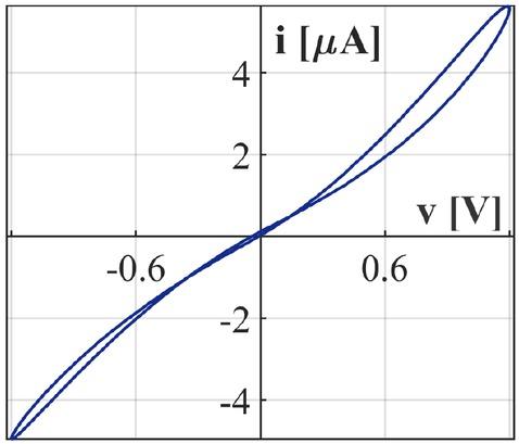Alternating current (AC) voltage-current plot of subject B at the earlobe, shown for the third period of applied sinusoidal voltage with frequency of 0.05 Hz and amplitude of 1.2 V. These data (not shown before) are obtained from the experiment presented in [22]. The two pinched points are indication that the stratum corneum memristor (in parallel with the capacitive properties of the stratum corneum) is dominating the measurement and that the galvanic contact through the sweat ducts was not given (see [22]).