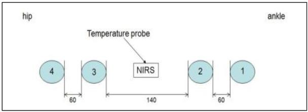 Placement of ECG electrodes for leg bioimpedance measurements.