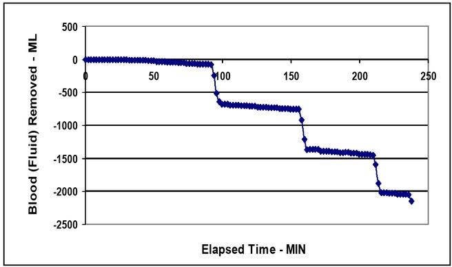 The amount of blood withdrawn during the simulated hemorrhage test is shown in Figure 4. The baseline period (0 - 90 min) is followed sequentially by three bleedings of 500 ml each at elapsed times of 80, 150 and 210 min.