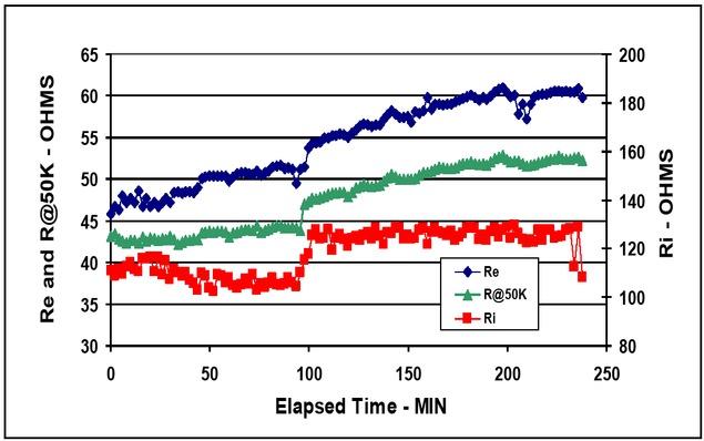 In Figure 9 are the three basal resistance measurements Re and Ri from the BIS and Ro from the IPG mode. Again, note that the Ri decreases during initial bleeding while Re and Ro increase. Ri seems to reach an equilibrium value and remain fairly constant thereafter. As in the first case, Ro and Re are almost identical in shape. As before, Ro must therefore reflect mostly that the fluid changes during simulated hemorrhage take place in the extracellular compartment.