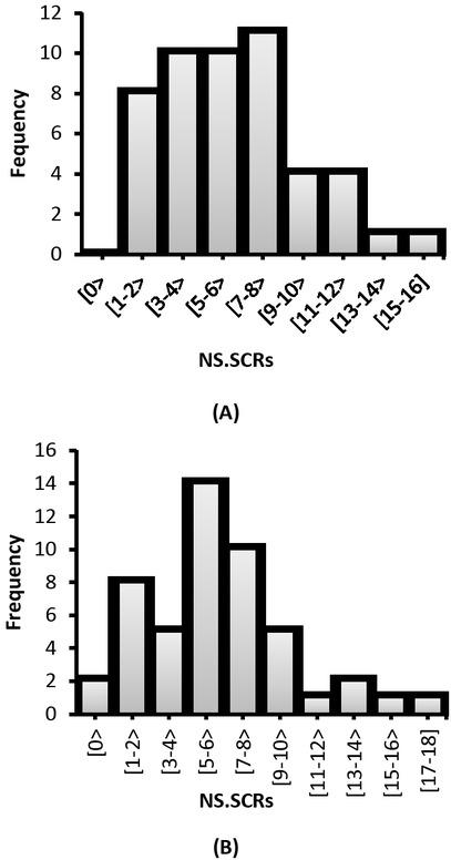 Distribution of NS.SCRs frequency for the total sample (n = 50): (A) first resting period, and (B) second resting period.