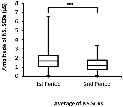 Box-plot with medians, quartiles and the min and max as whiskers shows average value of NS.SCRs_Amp at relaxation periods for all participants (n=50). **p<0.001