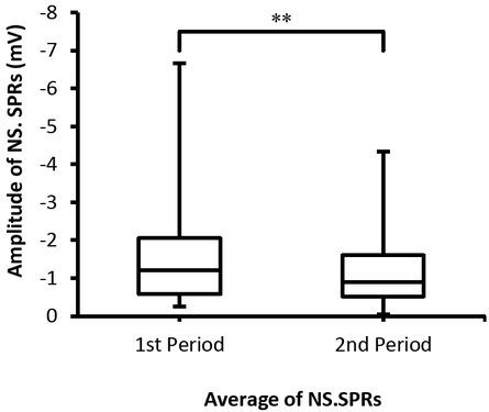 Box-plot with medians, quartiles and the min and max as whiskers shows average value of NS.SPRs_Amp at relaxation periods for all participants (n=50). **p<0.005
