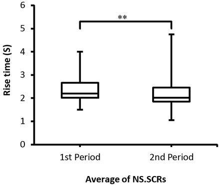 Statistical analysis on rise time data showed a significant difference (p<0.005) between rise time of NS.SCRs recorded at two resting times. In addition, it is clear from Figure 6 that, the median rise time value of NS.SCRs is decreased in the second relaxation period, following the math task.