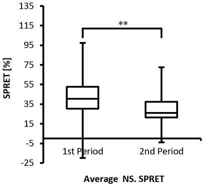 Box-plot with medians, quartiles and the min and max as whiskers shows average value of SPRET at relaxation periods for all participants (n=50). **p<0.001