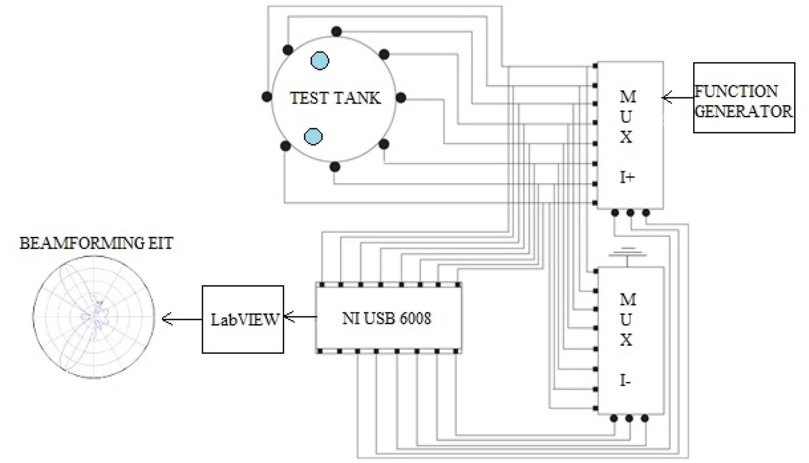 Complete block diagram of the developed beamforming EIT system. The input current is injected into the electrodes adjacently through the multiplexer circuit. The individual voltages are measured by NI USB 6008 from the non-current carrying electrodes. The beamforming algorithm displays the location of the test objects in the form of two beams.