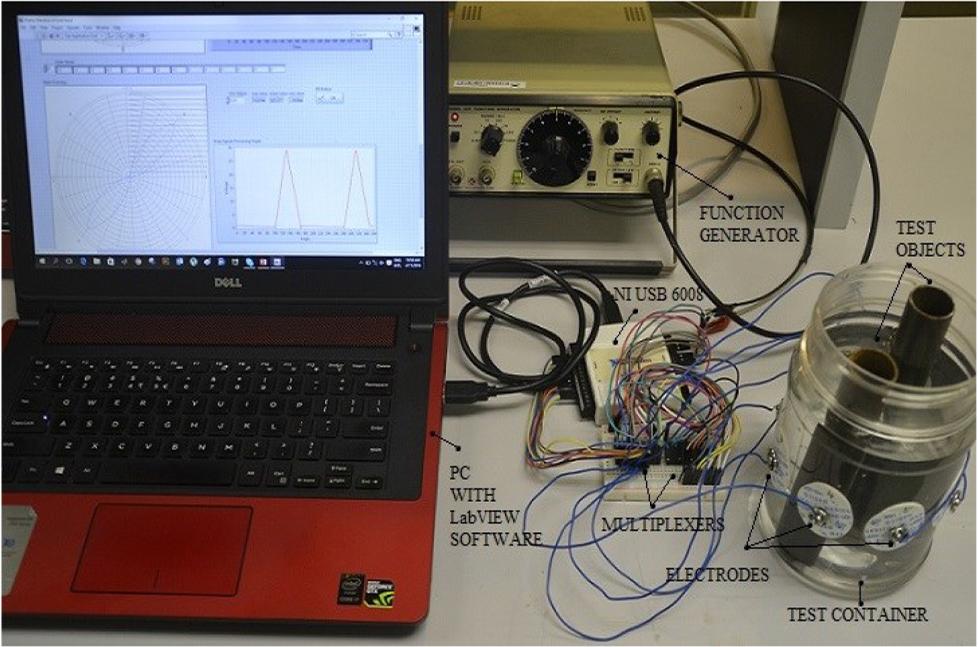 The National Instruments, NI USB 6008 DAQ (data acquisition) card acquires the voltage data from the electrodes as well as acts as a control device for the multiplexers. The complete experimental set up of the EIT system using eight (8) electrodes is shown in Fig 2.