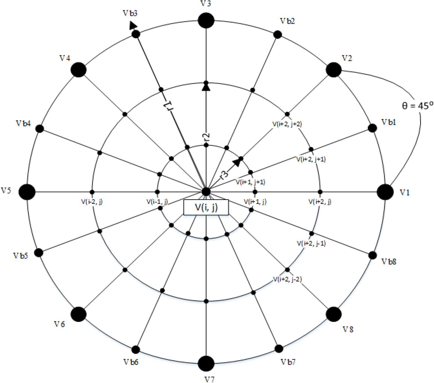 A circular test tank of radius r1. The radii of the two concentric circles are r2 and r3. Voltages V1–V8 are the measured electrode voltages. The electrodes are separated by an angle of θ=45 degrees. Vb1–Vb8 are the voltages obtained from bi-curvilinear interpolation of V1–V8. The voltages V(i, j)’s are the nodal voltages, which are derived from Gauss-Seidel method.