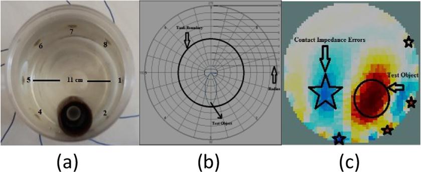 (a) = actual test object placed along the line of electrode 1, (b) = test object as located using beamforming algorithm. A thick circle represents the actual diameter of the test tank and (c) = test object as indicated by EIDORS. The circle represents the actual object while the stars indicate the contact impedance errors.