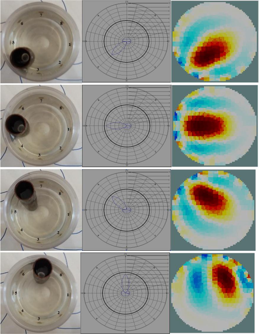 The test tank is filled with saline (10% NaCl) water for better conductivity. An eight electrode EIT system is considered for the simplicity of the design. A current of 6 mA at 50 kHz is injected adjacently w.r.t. ground. In return, the raw mono-polar voltages (assuming the noise levels to be negligible in the measured data, high SNR) are measured from the remaining non-current carrying electrodes in a cyclic manner which are later summed up for successive current patterns in a single measurement cycle. The basic image reconstruction of EIDORS [18] is considered for the comparison of the reconstructed images. A test object in the form of a hollow cylindrical iron rod was used. The dimensions include 15.5 cm length and 2.5 cm diameter. The test object(s) would be placed in line with the electrodes and then in the vicinity of the electrodes.