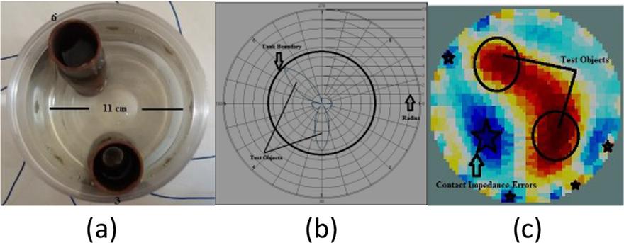 (a) = actual test objects placed along the line of electrode 3 and electrode 6 respectively, (b) = test objects as located using beamforming algorithm. A thick circle represents the actual diameter of the test tank and (c) = test objects as indicated by EIDORS. The circle represents the actual object while the stars indicate the contact impedance errors.