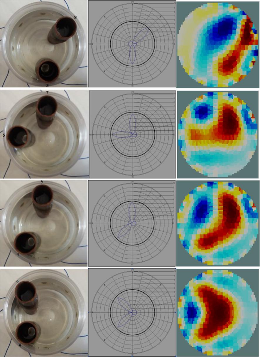 However, when a test object is placed between two electrode positions, the beamforming shows a flat response running across the two electrodes instead of showing a peak in between the two electrodes as seen in Fig. 8(a). This is due to the similar voltage drops captured by the two electrodes when the test object is placed between them. The same condition is also visible with two test objects placed between any two electrodes as shown in Fig. 8(b).