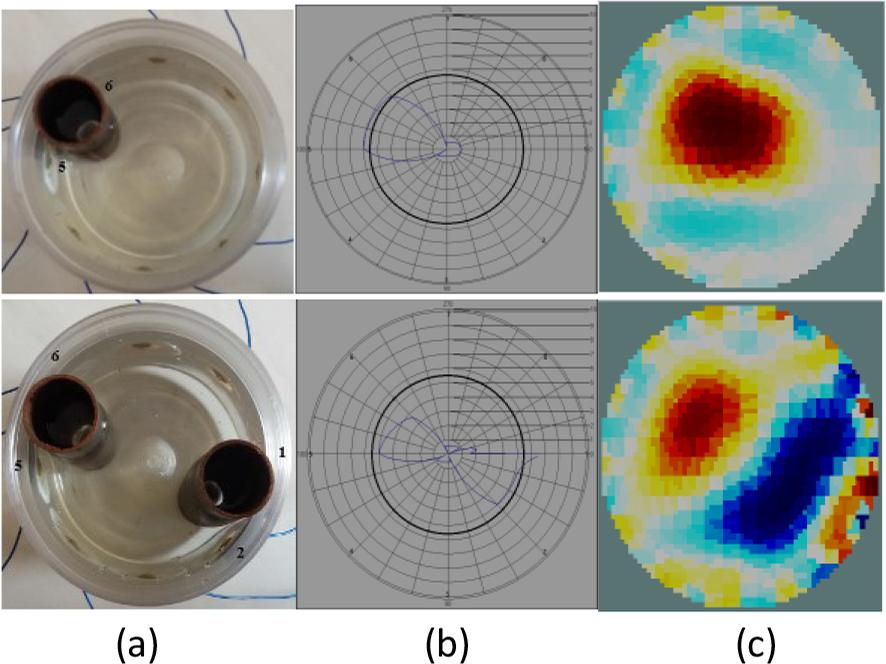 (a) A single test object placed between electrode positions 5 and 6 (top). Two test objects placed between electrode positions 1–2 and 5–6 (bottom). (b) The beamforming algorithm gives a flat beam across electrode positions 5 and 6 (top) and a flat beam across electrode positions 1–2 and 5–6 (bottom). (c) EIDORS results for the given locations of the test objects.
