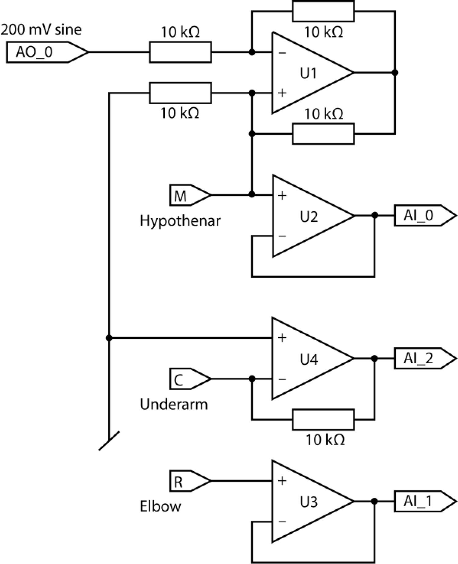 Operational amplifier (opamp) U1 is connected as a Howland circuit, producing a current i between the measuring electrode M and the current carrying electrode C.