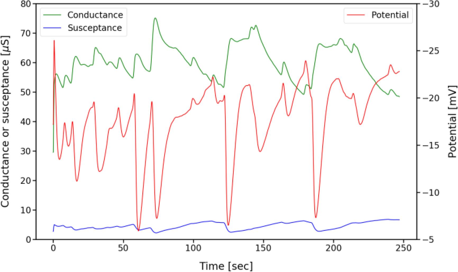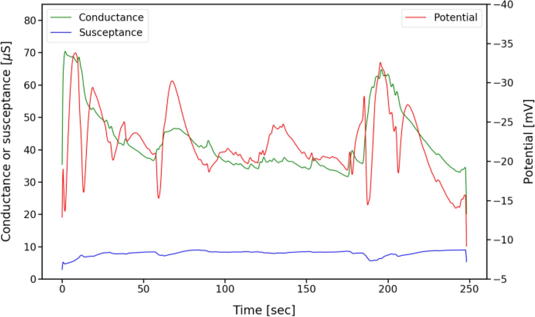 Measurements on a 19-year-old male healthy volunteer. Measured conductance in green, susceptance in blue and potential in red (right hand Y-axis).