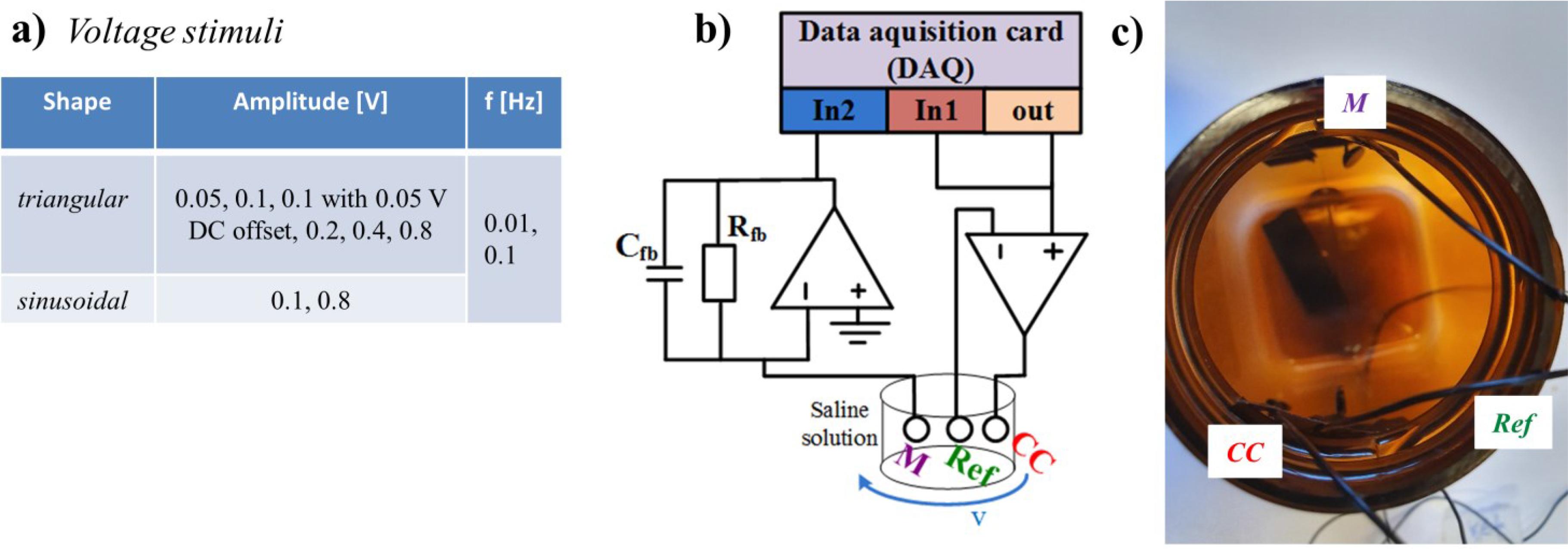 The recordings were done by the use of a custom built measurement system (see Fig. 1b and [4]). The setup contains a DAQ card (NI USB-6356) which is connected to a computer and controlled by a custom made program based on LabVIEW 2018. A three electrode system was used with “M” as the measurement electrode, with “CC” as the current carrying electrode and a reference electrode (“Ref”). The resistance of the feedback resistor Rfb was equal to 560 Ω and Cfb was equal to 4.7 nF.