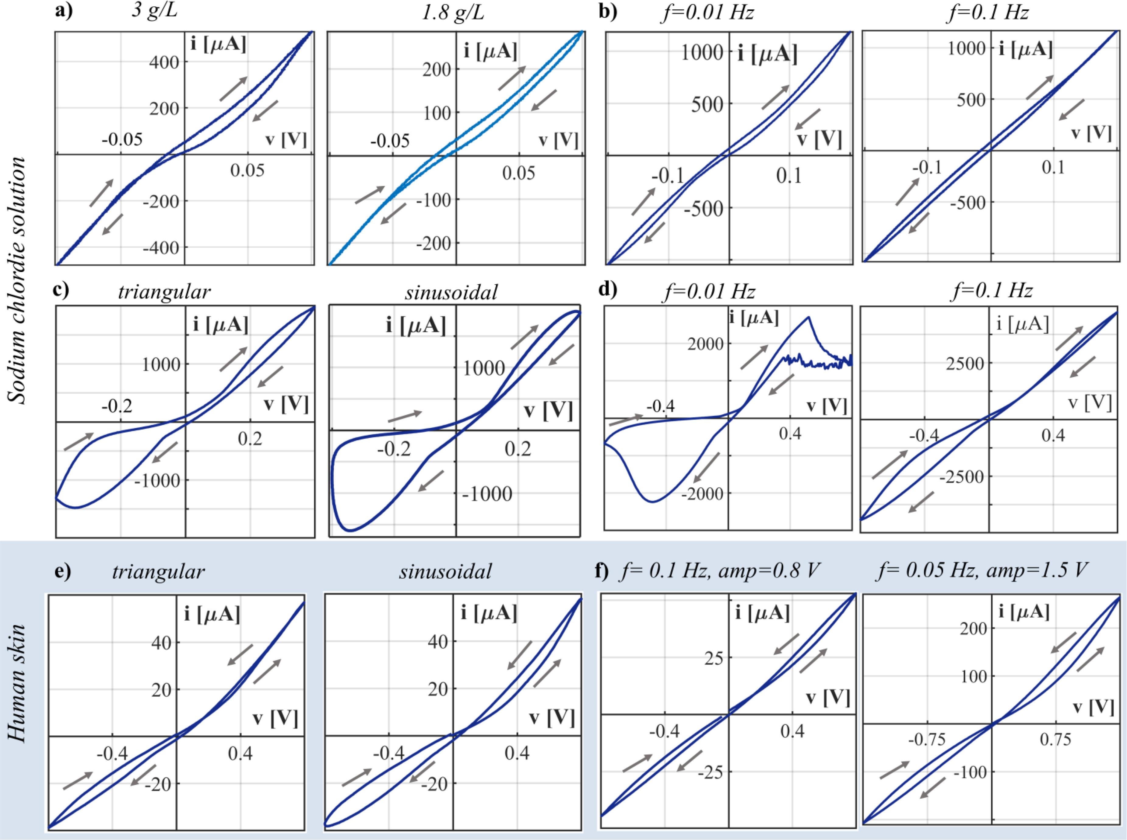 Voltage current plots recorded with the silver/silver chloride electrodes, always shown for the second period of each measurement. The arrows indicate the orientation of the pinched hysteresis loops. If not stated otherwise, the results from the recordings with applied triangular voltage are shown. Subplots a) to d) represent the recordings in the sodium chloride solution (3 g/l if not stated otherwise), and e) to f) are recordings of human skin from one test person at the forehead. a) Results from the recordings with 0.1 V amplitude and frequency of 0.01 Hz shown for two different solution concentrations (results from the 3 g/l sodium chloride solution are presented in dark blue and from the 1.8 g/l sodium chloride solution are presented in light blue). b) Results from the recordings with 0.2 V amplitude shown for two different frequencies. c) Results from the recordings with 0.4 V amplitude and f=0.01 Hz and two different voltage waveforms. d) Results from the recordings with 0.8 V amplitude shown for two different frequencies. e) Results from the recordings on human skin with 0.8 V amplitude and f=0.01 Hz and two different voltage waveforms. f) Results from the recordings on human skin with triangular waveform and 0.8 V amplitude and f=0.1 Hz and 1.5 V amplitude and f=0.05 Hz.