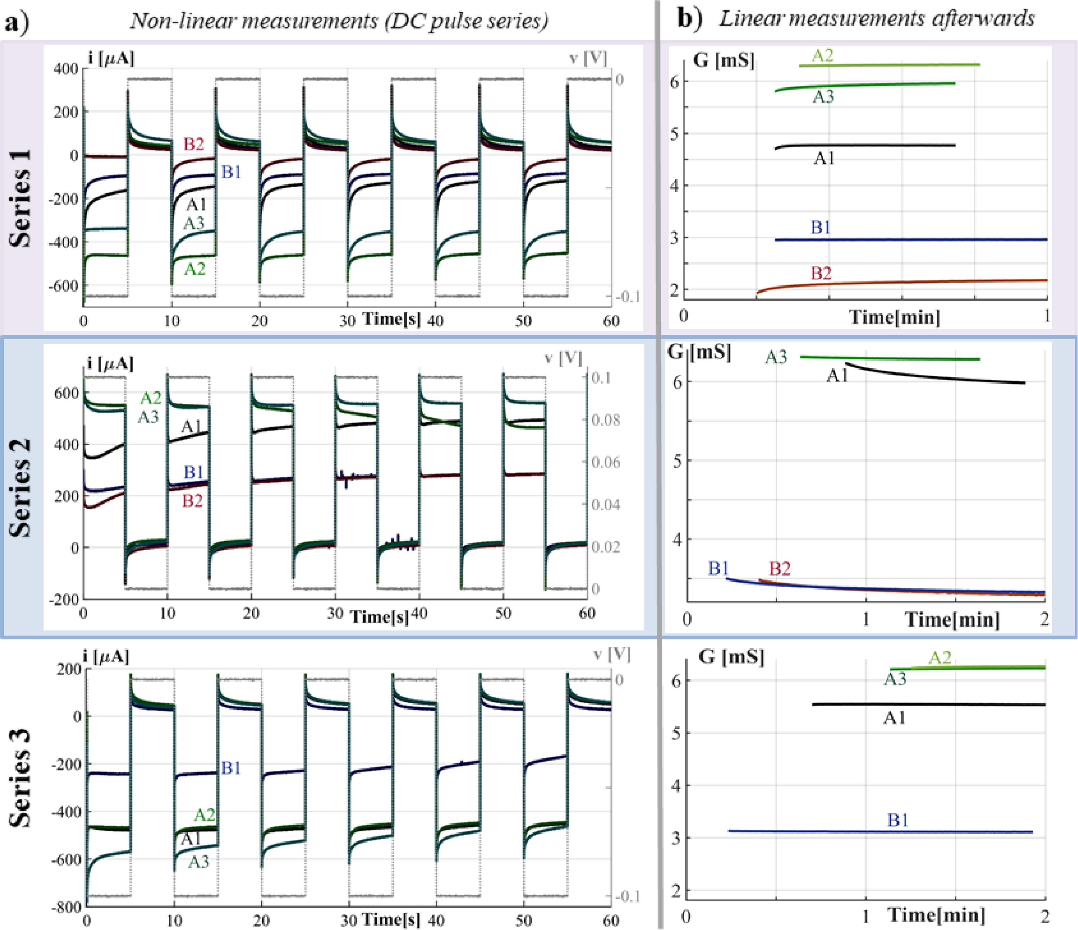 Results from the second experiment, recorded with the silver/silver chloride electrodes, A1, A2 and A3 reflect the measurements in the 3 g/L NaCl solution (first, second, and third time, respectively) and the B1 and B2 reflect the measurement results in 1.8 g/L NaCl solution. a) Non-linear electrical measurements with DC voltage pulses. Measured current, i, and applied voltage, v, plotted over time. b) Small-signal conductance measurements after each DC pulse series. The time is related to the end of the last pulse of the corresponding DC pulse series.
