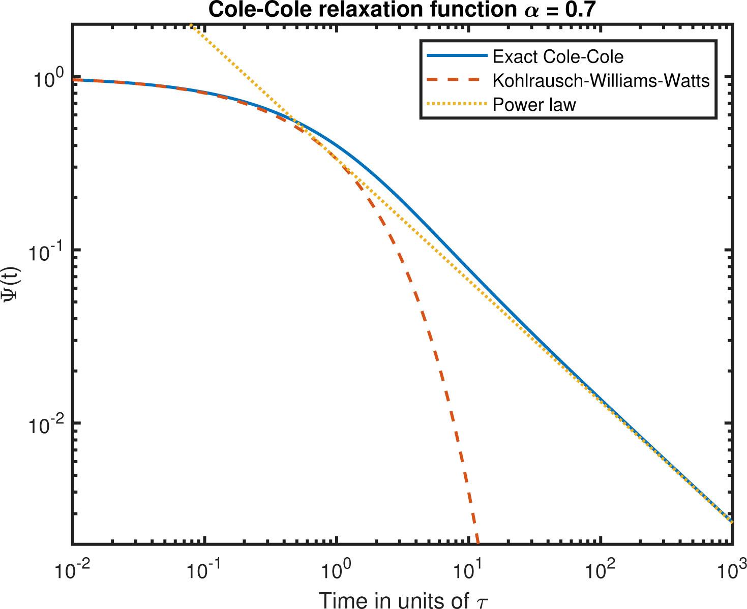 The small time approximation is the stretched exponential or Kohlrausch-Williams-Watt function of (2). For large values of t the Mittag-Leffler function approaches a power law [8].The relaxation function along with both its approximations are plotted in Fig. 2. Both approximations fit very well.