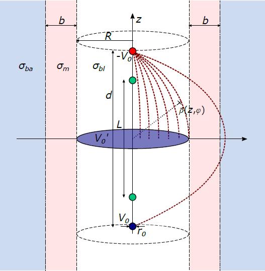 with dA = dd in cylindrical coordinates. R marks the radius of the blood cavity, r0 describes the diameter of the injection electrodes, and σbl the conductivity of blood.
