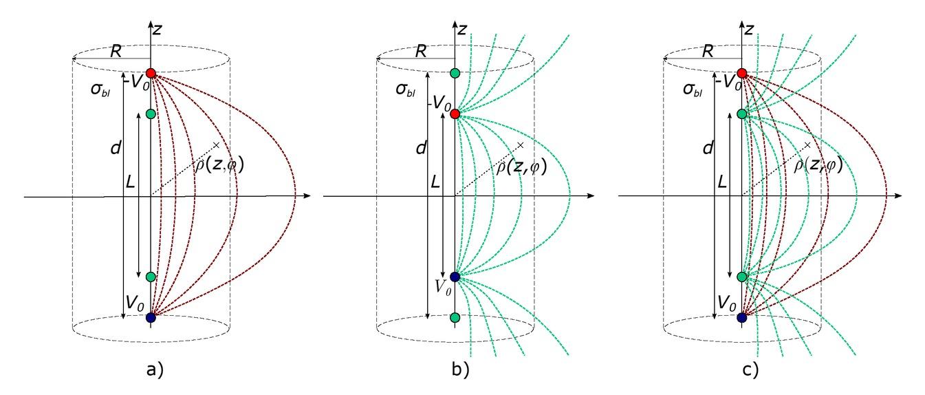 The analytical solution of this relationship was derived by modeling the electric field of two point charges, as depicted in Fig. 1, From electric field theory, the electric field distribution ~Esup of a superposition of two point charges in cylindrical coordinates (, , z) is given by