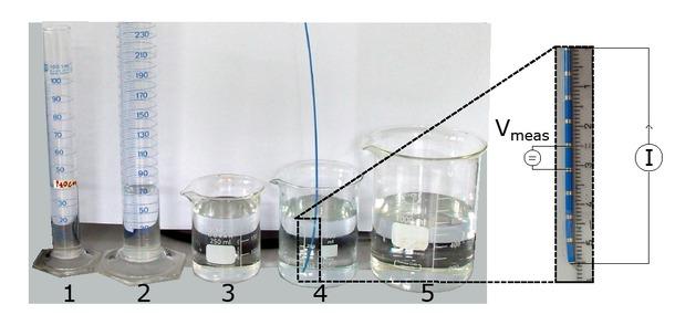 Left: five cylindrical glass containers representing simplistic volumes to test the measurement system and calculation methods. 1: radius 13.3 mm, 2: radius 17.5 mm, 3: radius 32.8 mm, 4: radius 38.6 mm, 5: radius 50.4 mm. Right: close-up on the measurement catheter and a possible cascaded measurement configuration.