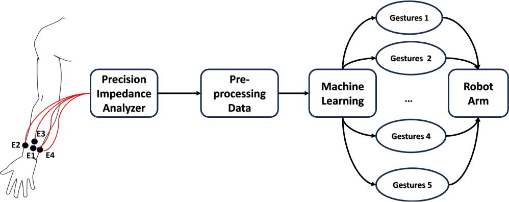 When impedance data are obtained, they are fed into advanced machine learning models that can identify complex patterns and nuances. These models can then classify and recognize various gestures with increased accuracy and effectiveness. The ultimate goal of this study was to apply these recognized gestures as intuitive, user-friendly, and nuanced controls to robotic arms, which can enhance their interaction and control granularity. This advancement represents a step toward achieving more natural, intuitive, and accessible human-machine interactive modalities, as illustrated in Figure 1. The following sections provide a detailed description of the methodology, experimental setup, data analysis, training, and evaluation of the machine learning model.