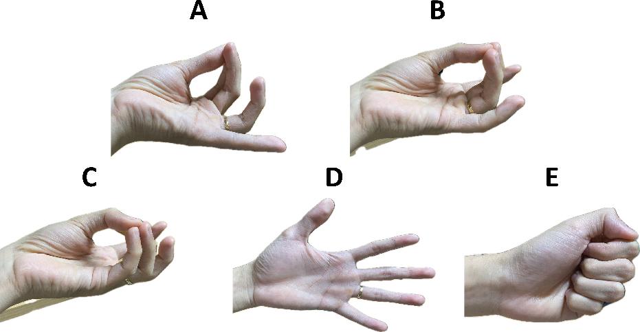 Evaluation of five hand gestures designed for holding, grasping, and relaxing activities.