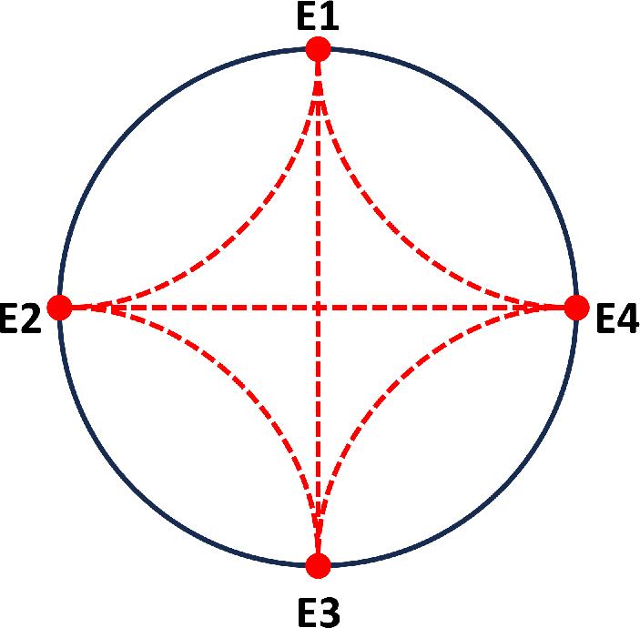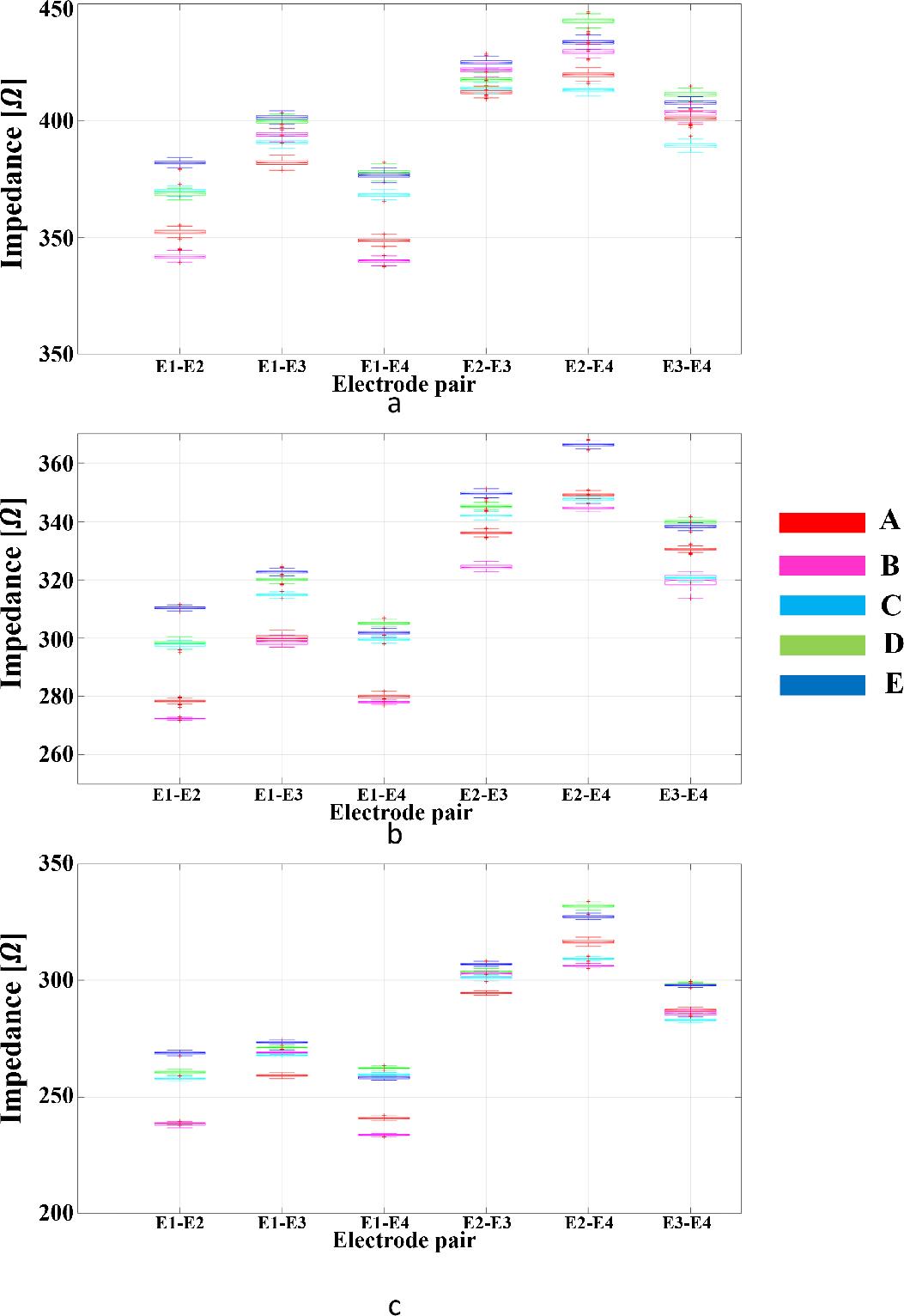 Electrode configuration for impedance data collection: using four electrodes (E1-E2, E1-E3, E1-E4, E2-E3, E2-E4, and E3-E4).