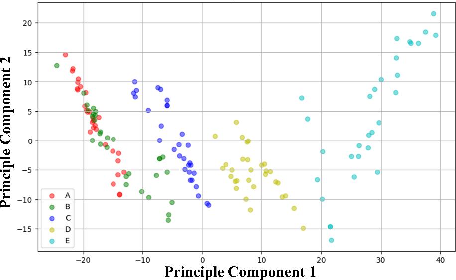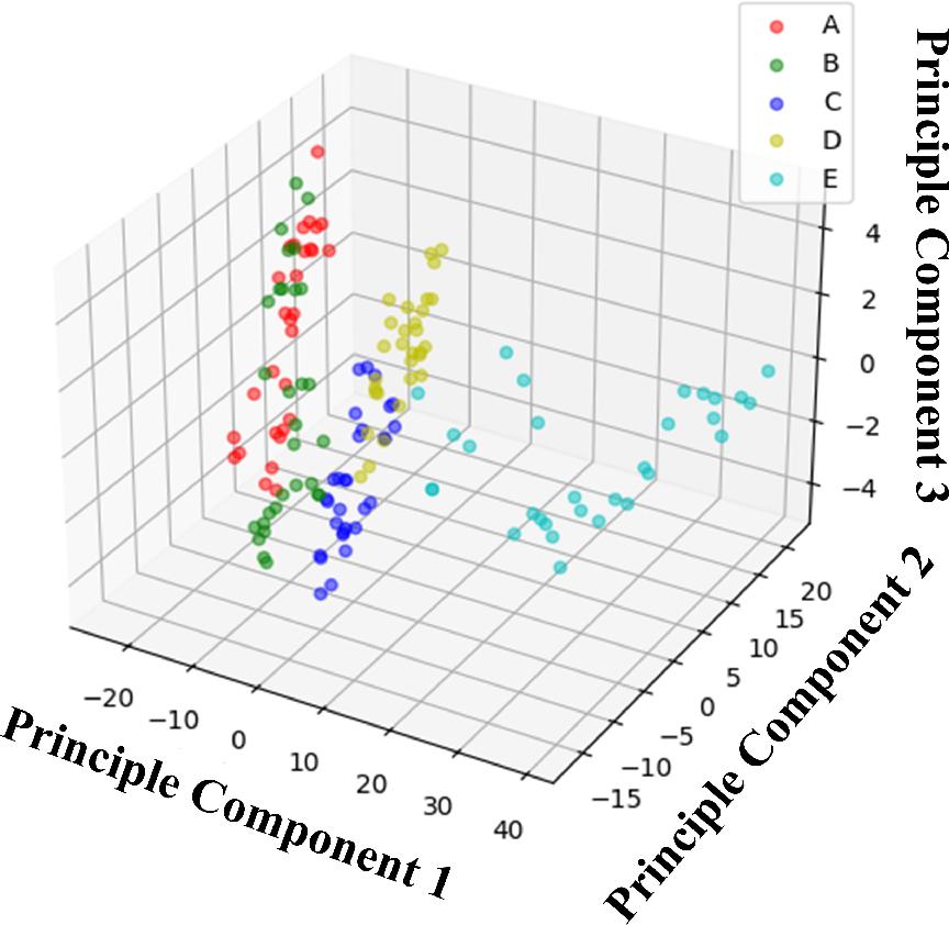 To provide further support, the principal components, which are primarily influenced by lower-spectrum frequencies, show a notable separation in the resistive characteristics of most gestures. However, they face challenges when confronted with the nuanced disparities between gestures “A” and “B”. Morphological similarity, evident in closely aligned resistive profiles, leads to a conflation of identities, as reflected in the PCA loadings, demonstrating overlap or proximity in the PCA space. This trend suggests the need to explore more complex nonlinear models or integrate additional features, potentially influenced by temporal aspects, to better distinguish between these two gestures.