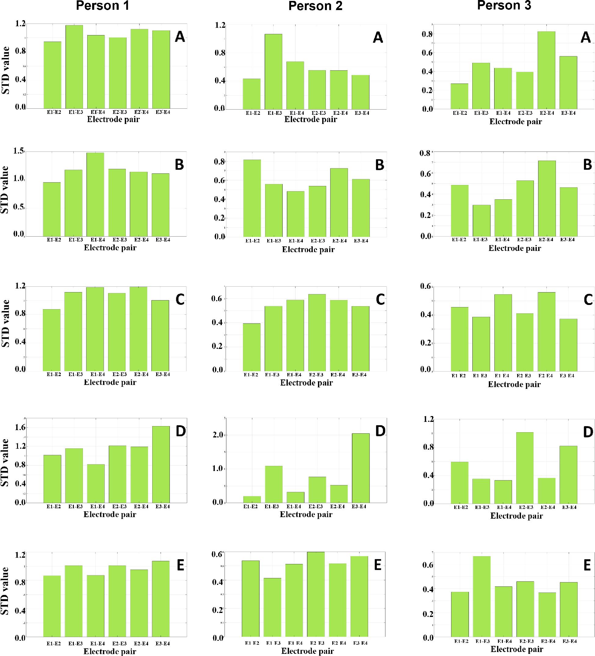 Standard deviation values for sample data from 3 volunteers with labeled gestures A, B, C, D, and E for Person 1, Person 2, and Person 3.