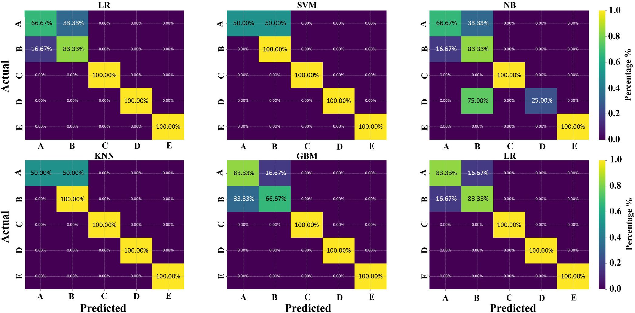 Examining the confusion matrices (Figure 11) reveals a recurring pattern, where the gesture “A” is frequently misclassified as “B” and vice versa. This difficulty is substantiated by the varying misclassification rates among gestures in the different models. In the KNN model, 50% of “A” gestures were misclassified as “B.” In the GBM model, a significant misclassification occurs with 16.67% of the “A” gestures misidentified as “B” and 33.33% of “B” gestures misclassified as “A.” Naïve Bayes displays a distinct pattern, with 33.33% of “A” gestures misclassified as “B” and 16.67% of “B” gestures misclassified as “A,” as well as 75% of “D” gestures misclassified as “B.” The RF, LR, and SVM models exhibited different misclassification patterns, highlighting the intricate challenge of accurate classification in various model architectures.