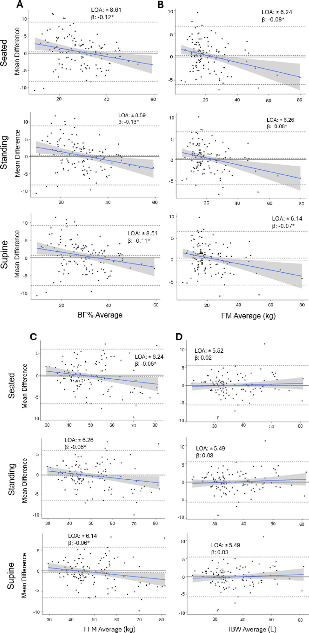 Bland-Altman analyses for body composition and total body water estimates measured by SWBIA and the criterion DXA and BIS in females. Bland-Altman plots for BF% (a), FM (b), FFM (c), and TBW (d) estimates by SWBIA body position (rows) are displayed. The upper and lower dashed lines on each plot represent the 95% limits of agreement, and the middle-dashed lines represent the mean difference between SWBIA and the criterion DXA or BIS. The solid blue line represents the regression line, and the surrounding shading represents the 95% confidence interval of the regression line. SWBIA: smartwatch bioelectrical impedance analysis; DXA: dual-energy X-ray absorptiometry; BIS: bioelectrical impedance spectroscopy; BF%: body fat percentage; FM: fat mass; FFM: fat-free mass; TBW: total body water; LOA: 95% limits of agreement. *, significant proportional bias at p ≤ 0.003.