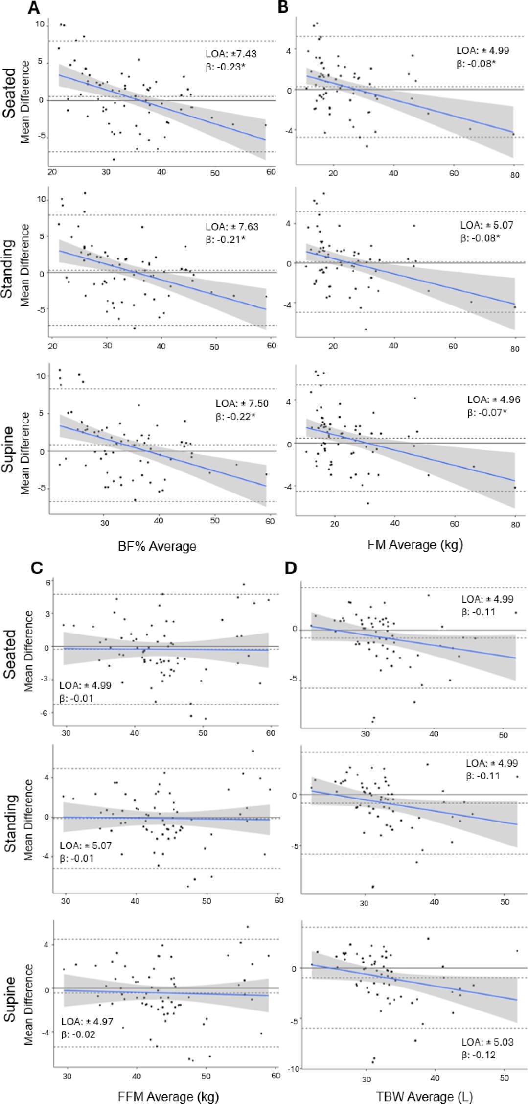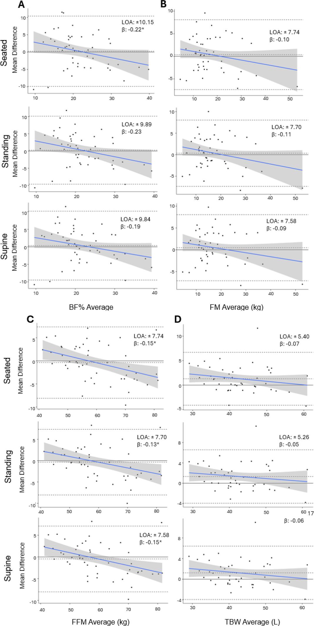RMSEs ranged from 4.37-4.40% for BF% and from 3.15-3.19 kg for FM and FFM; all of which were lowest for the supine position. R2 ranged from 0.82-0.93 and CCC’s ranged from 0.90-0.96; which were similar across body positions. Proportional biases were observed for all estimates in the combined sample (Figure 1a-d; all p ≤ 0.026). Large LOA were observed for BF% (±8.51-8.61%) and FM and FFM (±6.14-6.26 kg) with the lowest LOA observed while supine (Figure 1a-d).