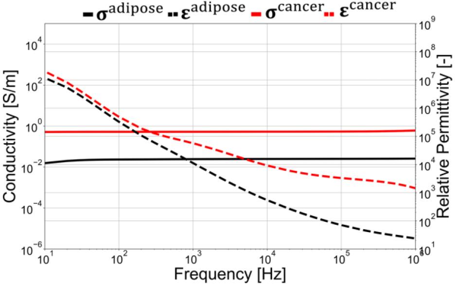 This study represents a preliminary investigation into the application of electrical impedance tomography (EIT) for breast cancer recognition. The use of simplified, hemispherical models in the simulation was chosen initially to establish foundational insights into impedance response, specifically focusing on impedance as a parameter for locating potential cancerous lesions within breast tissue. While we acknowledge that real breasts are soft and exhibit non-hemispherical shapes, these factors were simplified in this preliminary phase to facilitate controlled exploration of impedance characteristics. Spherical breast cancer is made with a diameter ∅cancer= 10 mm with the cancer position set close to layer 1. The breast container is composed of adipose tissue and breast cancer. Fig. 3 shows the electrical properties utilized in this simulation. The electrical properties of breast cancer are employed with the electrical properties of breast glandular. In this case, we assumed that the conductivity σ and permittivity ε of breast cancer σcancer, εcancer are higher than adipose tissues σadipose, εadipose. The authors employed glandular breast tissue conductivity and permittivity as representative parameters for breast cancer tissue, given the absence of specific data on its electrical properties along with the frequency data we used. Imaging cancer in dense breast tissue, which contains a substantial glandular component, is inherently challenging. However, data limitations led to this approach. Incorporating breast cancer-specific parameters into a background with a larger glandular component would enhance the simulation’s relevance and accuracy. Until breast cancer tissue data is available, glandular tissue attributes are utilized to approximate the situation as closely as possible.