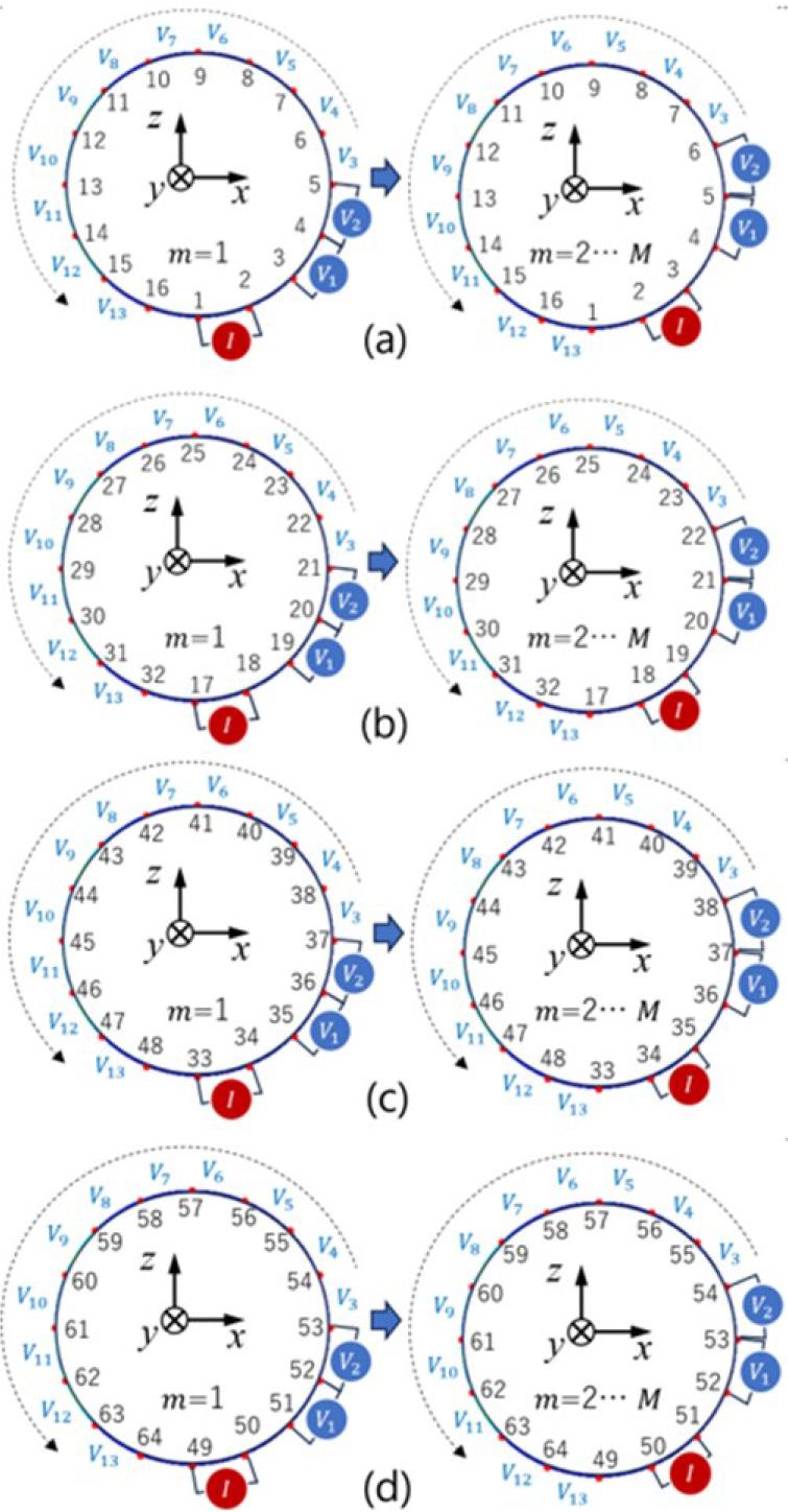 Here, ϕ(Ia) represents the potential field influenced by the injected current I into the a-th electrode, while ϕ(Ib) denotes the potential field observed at the b-th measuring electrode. The variable Zm corresponds to the measured impedance at the m-th measurement instance (1≤m≤M), which is obtained from the measurement voltage vm. σg represents the conductivity at the g-th mesh element (1≤g≤G). Ω represents the region of the electric field within the EIT sensor. Furthermore, Gaussian-Newton is utilized to obtain the conductivity distribution which is defined by [18]