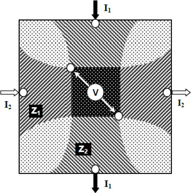 The Focused Impedance Method (FIM) developed at Dhaka University uses 8, 6, or 4 electrodes in its three versions to localize a small zone in a volume conductor. The 6-electrode FIM configuration (FIM-6) is shown in Figure 2 for a two-dimensional conductor [1]. Here, small white circles indicate the electrodes. Two alternating currents, I1 and I2, are driven between two electrode pairs arranged vertically and horizontally, respectively, as shown in the figure. Two electrodes for measuring potential (potential electrodes) are placed at intermediate diagonal positions, which are the intersection points of the respective equipotential lines due to the two currents in perpendicular directions, as shown in the figure. The potentials V1 and V2 measured across these potential electrodes are due to the currents I1 and I2, which individually give the potential differences between the two pairs of equipotential lines shown by the edges of the horizontally shaded region and vertically shaded region, respectively. Furthermore, the values V1/I1 and V2/I2 essentially give the Transfer Impedance TZ1 and TZ2 of the horizontal shaded region and vertical shaded region, respectively, though the contribution of different sub-volumes within this region will vary.