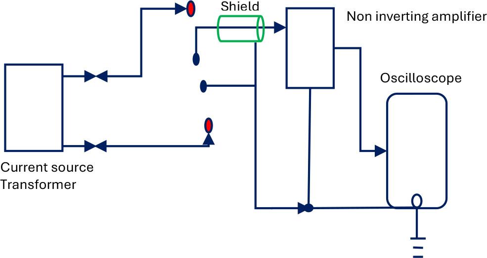 The circuitry used is shown in Figure 3. The outer red circled dots are the current electrodes while the middle blue circled dots are the potential electrodes. The current source transformer (TR1) used for the study had 15 turns in the primary coil and 60 turns in the secondary coil. The actual current passing through the human body was estimated by placing a 55 ohms resistor in series with the secondary coil of TR1, which was removed during actual measurements on the human body. A metal sheet, to be attached to a suitable place on the body of the subject, was connected to circuit ground along with the power supply ground to minimize noise due to 50 Hz AC mains supply.