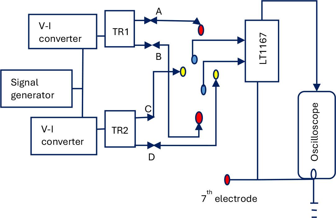 The circuit for FIM-6 follows the original design from 1999 by Rabbani et al. [3]. As mentioned in the previous section this arrangement needs concentric and orthogonal current drives using two pairs of electrodes, and the potential is measured using a diagonal electrode pair, which is also concentric with the current electrodes. A basic block diagram of the relevant parts of the FIM-6 circuit used for the present work is shown in Figure 5. Here, the outer red dots represent one pair of current electrodes while the yellow dots represent the electrodes of the orthogonal current drive. The two blue dots in the middle represent the diagonal potential electrodes. If the alternating currents through both the current drives are maintained constant at the same value, I, and if the potential measured across the middle electrodes be V, then the focused impedance, FZ is given by,