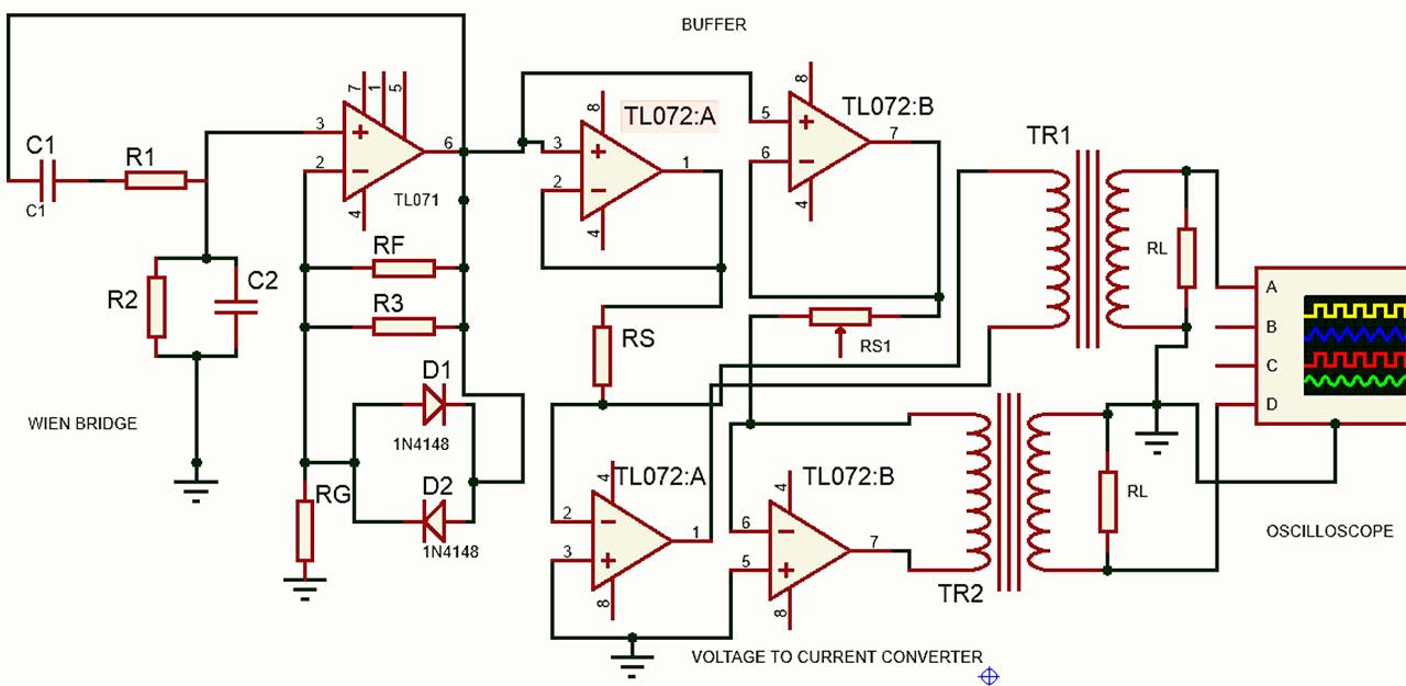 The circuit used for the two sets of orthogonal current drives is shown in Figure 6. The first section on the left is a Wien bridge oscillator producing a sinusoidal alternating voltage of a chosen frequency and amplitude. This is then taken to two unity gain buffers the outputs of which are used to drive two separate voltage-to-current converter circuits. Here the load seen by each voltage-to-current converter circuit essentially is a compound one, consisting of the final load at the secondary windings of the current transformer. This compound load is connected between the output and the inverting input of the respective opamp. The currents through the two loads at the secondary outputs of the two transformers are balanced using series resistors RS and RS1 from the outputs of the buffers to the inverting inputs of the two opamps that make the voltage-to-current converter circuits.