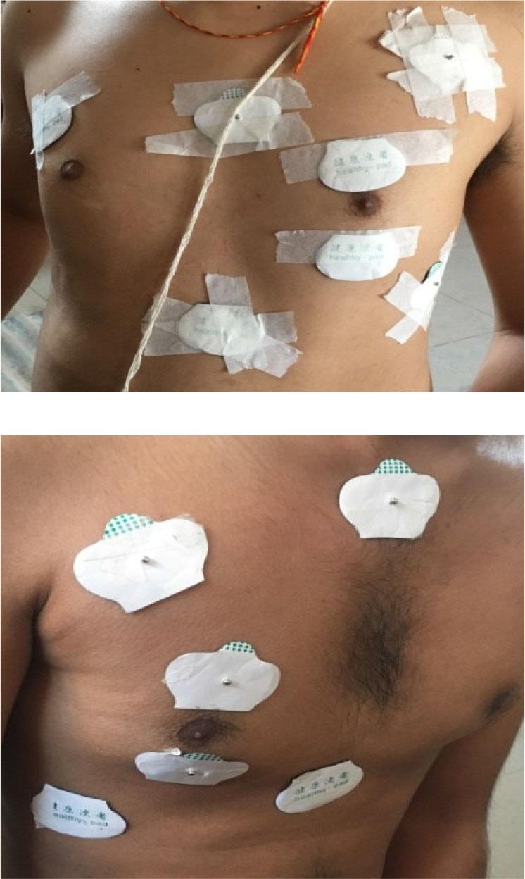 Electrode placement for measurement at the lower left lung (top) and the lower right lung (bottom).