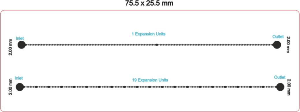 The first chip (labeled as chip A) consists of two channels with different numbers of expansion units. One channel has one expansion unit, and the other has 19 expansion units, both at the same length of 62.76 mm. The inlet and outlet holes are 2.00 mm in diameter. Figure 1 represents the diagram of the chip A.