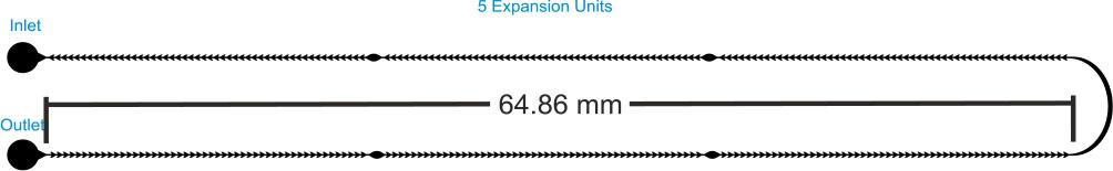 The second chip (labeled as chip B) comprises two lines measuring 64.86 mm, with five expansion units. Figure 3 shows the second microfluidic channel. The connection between the upper and lower channels is considered an expansion unit with a larger space because the thickness of this connection channel is 0.5 mm. The motivation in studying the configuration of Chip B is to outline the performance frontiers of a multi-line design, assessing how interconnected expansion units influence oocyte transport and denudation.