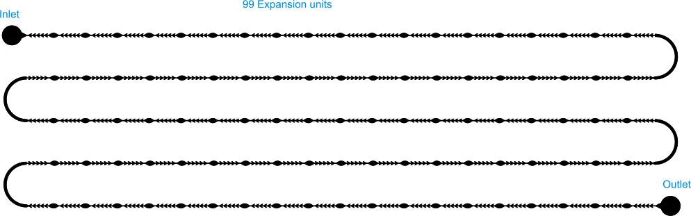 In line with the above configurations, another study increased the number of expansion units and channel lines, labeled as chip C. Figure 4 describes the third microfluidic chip C with 99 expansion units and five channel lines. The connection channels are also considered expansion units.